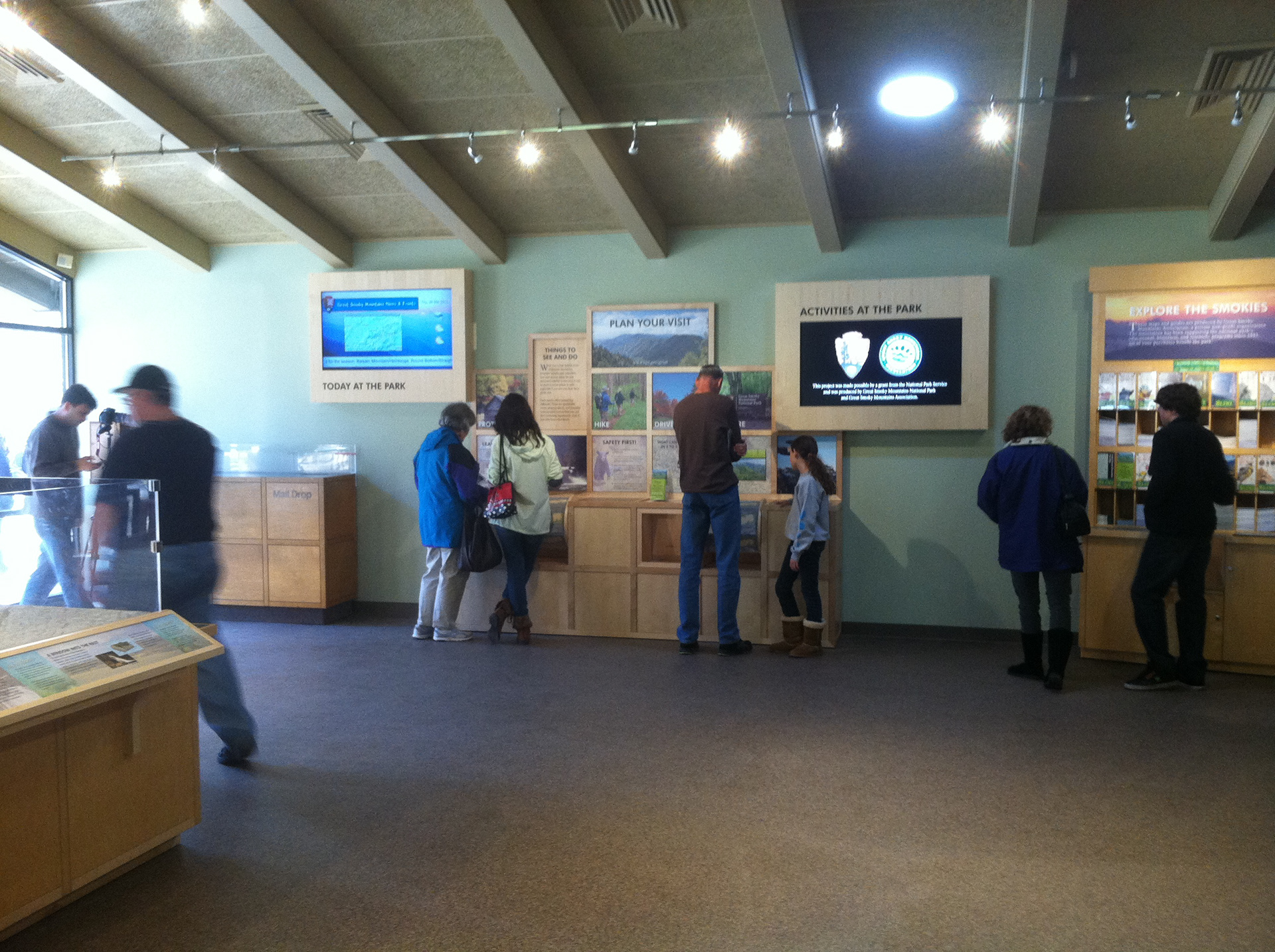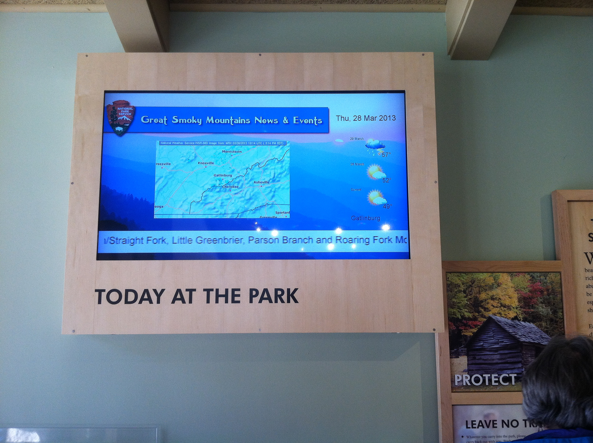 I designed and programmed this Spinetix presentation for the Great Smoky Mountain Visitor's Center in Gatlinburg, TN. This presentation shows weather, radar, date, RSS feed for the park's events.